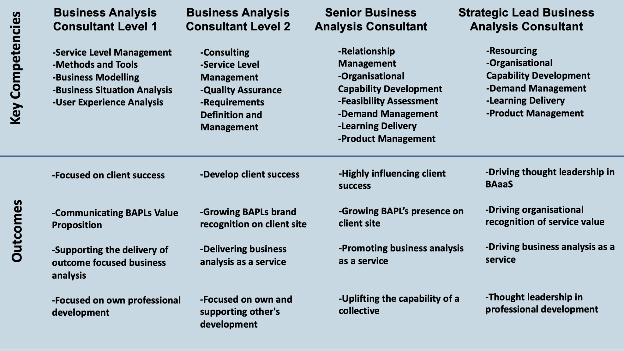 - Four competency levels define a BAPL consultant’s progression.
