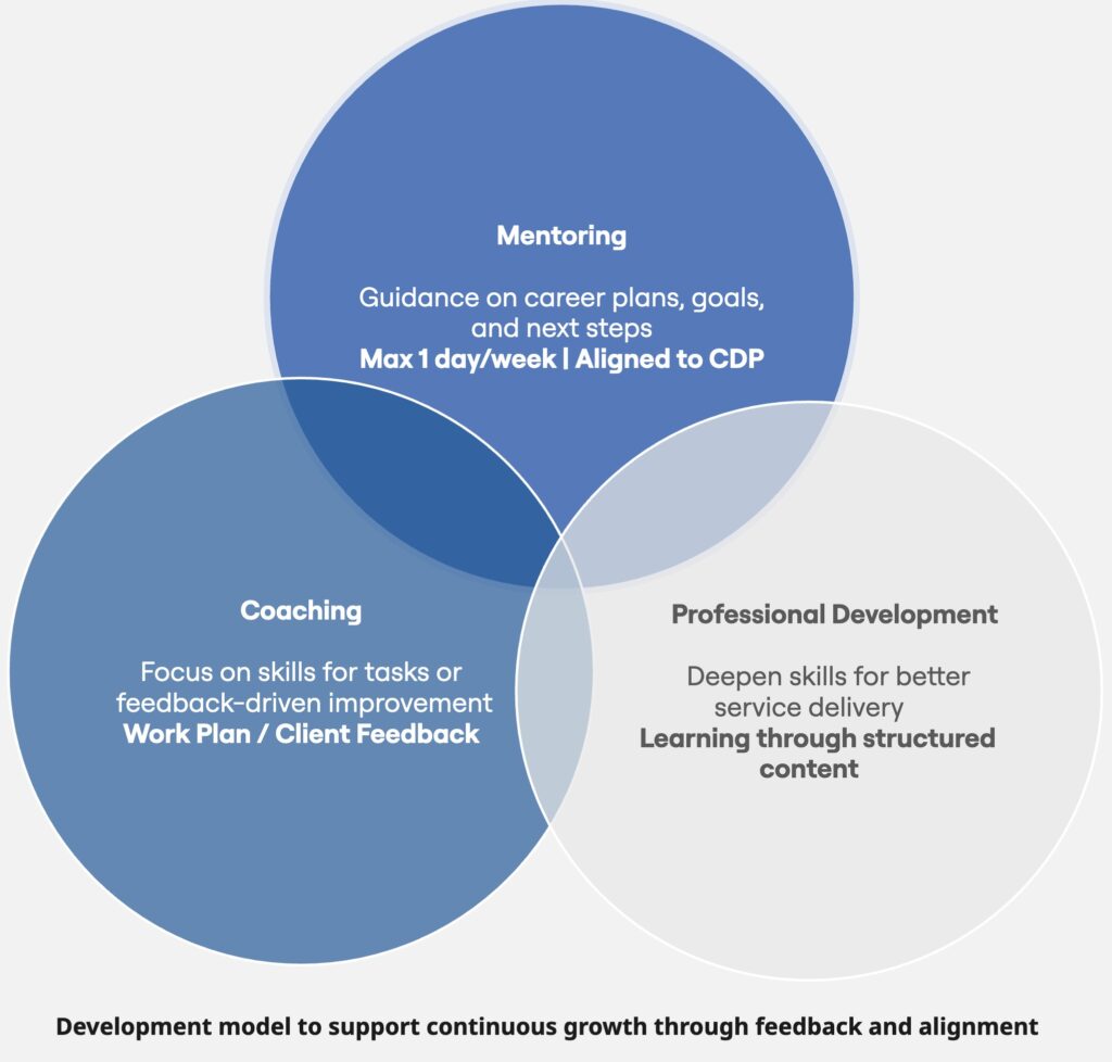 - Mentoring aligns with the consultant’s Career Development Plan and helps keep them on track with professional growth.